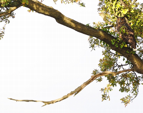 The Eagle Owl soon appeared again in the trees that bordered the aviary area, we watched with amazement with many thoughts entering our heads to where it had escaped from. The one thing we did notice was when we got within 10ft, the Owl wasn't wearing any anklets or jesses. The feathering around the Owls legs were untouched & natural looking, there were no signs of leg wear from leather anklets, these are normally worn by captive bred Owls. The question that is unanswered is this: Is he a wild bred Eagle Owl or a captive bred escapee; this is something we will never know especially as there have been no know reports of anyone loosing an Eagle Owl in the County.