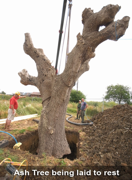 Ashley and Ben volunteered their skills alongside the co-ordinated efforts of Sparrow Crane Hire. The tree weighing over 6 ton was secured safely with chains before it was cut and lifted into its new safe location, once there the Ash tree was placed into a 6ft hole and encased with 6 cubic metres of concrete.