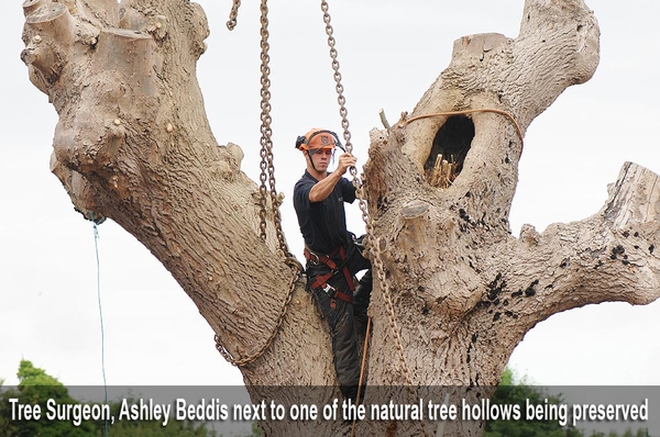 Preserving the tree and encasing the main trunk within a concrete base, this will extend its use for wildlife for at least another 15 years, even though its dead, it is still solid enough to provide a natural and safe tree house for nesting birds with its many natural nest holes.