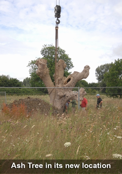 Ashley and Ben volunteered their skills alongside the co-ordinated efforts of Sparrow Crane Hire. The tree weighing over 6 ton was secured safely with chains before it was cut and lifted into its new safe location, once there the Ash tree was placed into a 6ft hole and encased with 6 cubic metres of concrete.