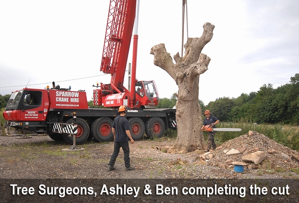 Ashley and Ben volunteered their skills alongside the co-ordinated efforts of Sparrow Crane Hire. The tree weighing over 6 ton was secured safely with chains before it was cut and lifted into its new safe location, once there the Ash tree was placed into a 6ft hole and encased with 6 cubic metres of concrete.